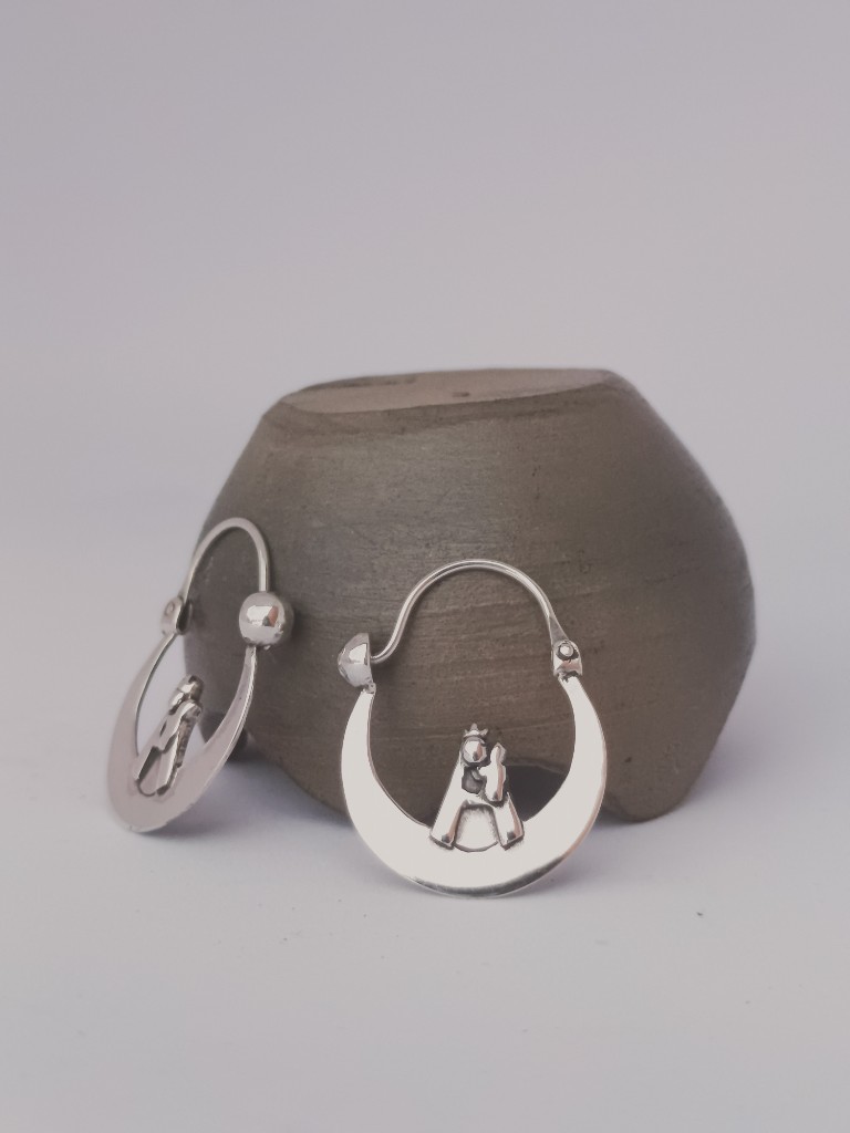 Modelo de argolla canaria muy especial, con una pequeña y sencilla representación la Virgen de Guía en la zona central. La pieza combina la estructura tradicional con un símbolo religioso muy ligado a la identidad del municipio y de toda la zona Norte de la isla, creando un pequeño recordatorio de origen y pertenencia que acompaña con discreción y luz